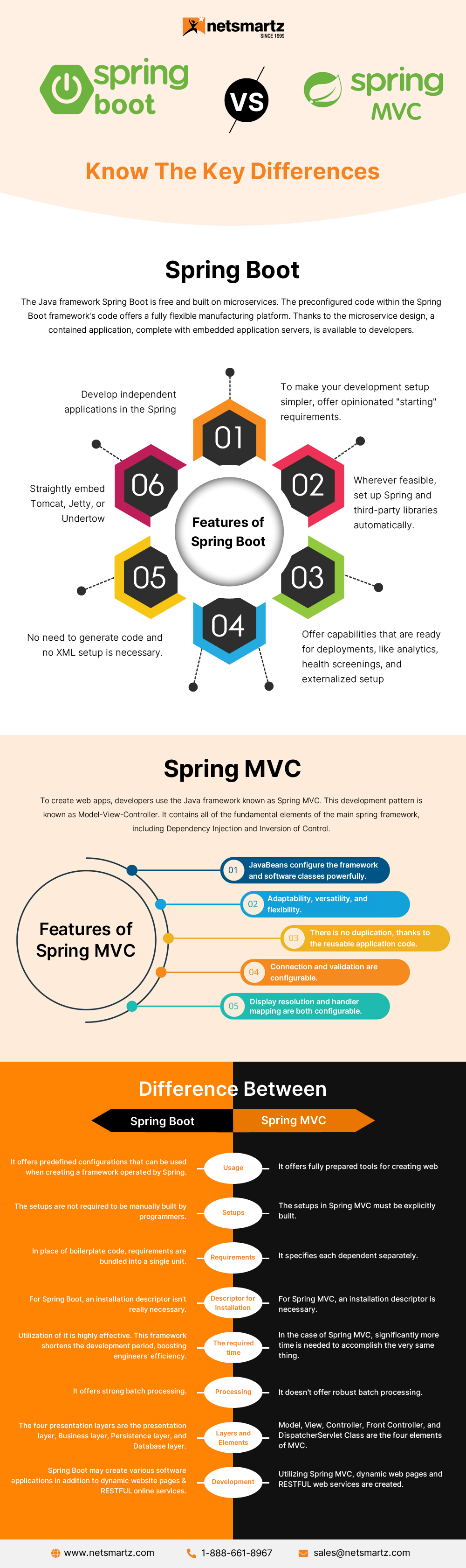 This infographic will go through both frameworks, how spring boot & MVC differ, and who is a better player per your business requirements—