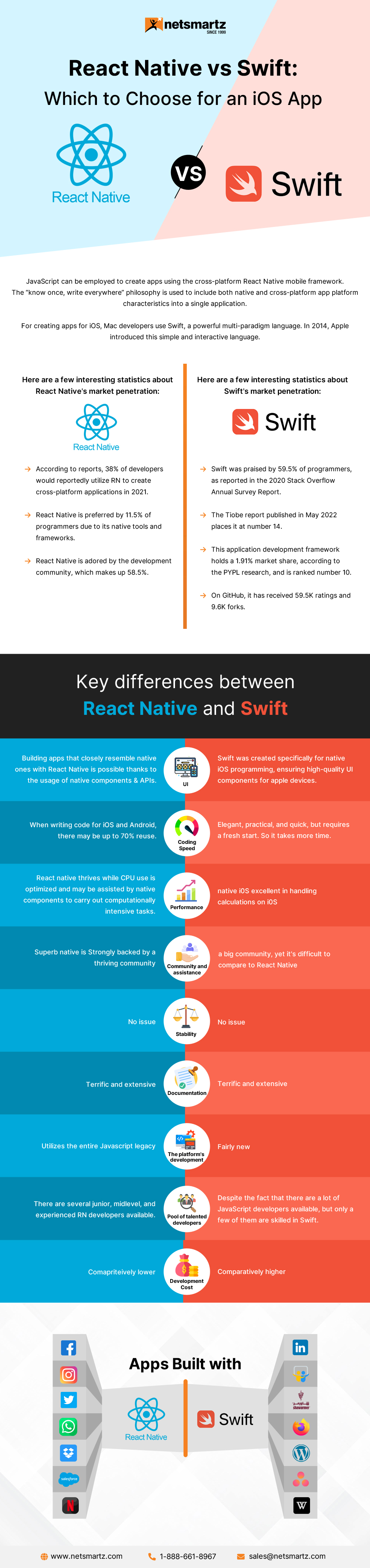 This infographic intends to give a clear understanding between React Native and Swift, which will help businesses to decide the most appropriate one for their project.